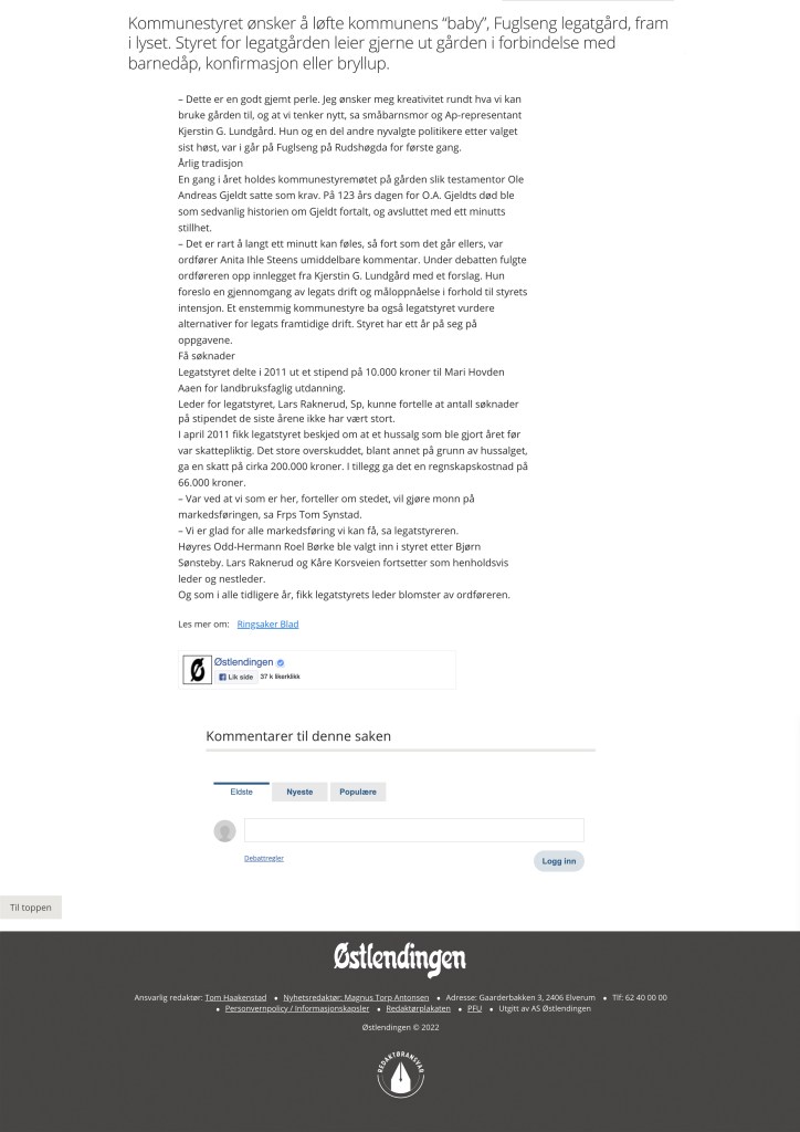 Hvorfor fikk vi utdelt testamentet med ønsker og pålegg fra testator O.A. Gjeldt når vi ble ønsket velkommen til gården av styret? Det som står i testamentet, virker det som ingen bryr seg om lenger. Var det fordi ordføreren forsto at vi ikke kom til å ta imot invitasjonen, hvis det ikke var for folket vi gjorde dette. Ordføreren sier kommunestyret er øverste eier av legatgården, senest, på kommunestyremøtet 8. mars 2021. Sier hun det for å fortsette og lure Ringsakers befolkning, slik at de skal tro at gården fortsatt er deres gård og at alt er som det alltid har vært?