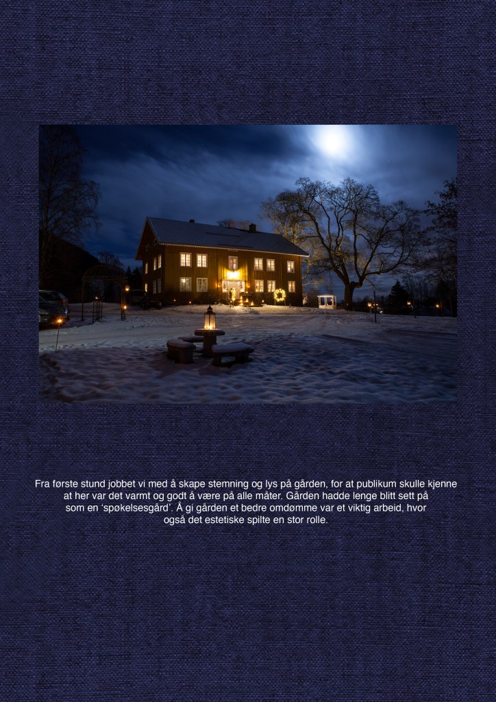 Vi skulle samarbeide med styret på gården. Styret bestod av folkevalgte fra kommunestyret. Ordføreren sa at styret hadde egen god økonomi som ikke ville være berørt av eventuelle svingninger i kommuneøkonomien. Her er det muligheter, sa hun. Ordføreren sa videre at hun visste hvilken ressurs vi var. Dere vil få det godt her i Ringsaker, sa hun. Vi bestemte oss for å ta imot utfordringen og flyttet til legatgården sommeren 2012. Vi følte oss da ønsket, verdsatt og velkommen. Vi var stolte over muligheten vi hadde fått og visste at vi hadde viktige verdier å tilføre.Dette ble fort en livsstil med alle utfordringene det hadde i seg. Vi trengte å ta i bruk alle ressursene vi hadde for å utnytte potensialet i gården best mulig, mens vi arbeidet med å få til en bedre bærekraftig situasjon. Bakgrunnen for at vi var invitert hit, var hele tiden drivkraften i prosessene. Dette var for Ringsakers befolkning. For å klare den oppgaven var vi nødt til å få en større økonomisk bærekraft, for å oppfylle forventningene fra kommunen. Vi fikk kjenne på alle følelser, men angret ikke på at vi hadde tatt utfordringen vi fikk av ordføreren og flyttet. Vi hadde ståltro på potensialet i prosjektet. Vi kjempet oss gjennom mange utfordrende perioder. Det krever mye pågangsmot for å få til en bærekraftig drift på en så gammel gård. Bare begrensningene i bosituasjonen krevde en stor fleksibilitet. Men vi var glade i folk og likte gamle hus med sjel. Vi åpnet alle rommene i hovedhuset for publikum, under arrangementene våre. Kun soverommet var stengt av. Mange syntes dette var helt utrolig. Men det var med på å skape den nære «hjemme hos oss»-følelsen som vi ønsket. Vi kalte det et «kunstnerhjem». Sakte, men sikkert, løftet vi frem spøkelsesgården, som noen kalte den, til noe positivt som folk fikk et godt forhold til og satte pris på. En må være litt gal for å gå inn på et slikt prosjekt. Vi hadde tro på at vi skulle klare det. Vi hadde med oss masse viktige og relevante erfaringer.